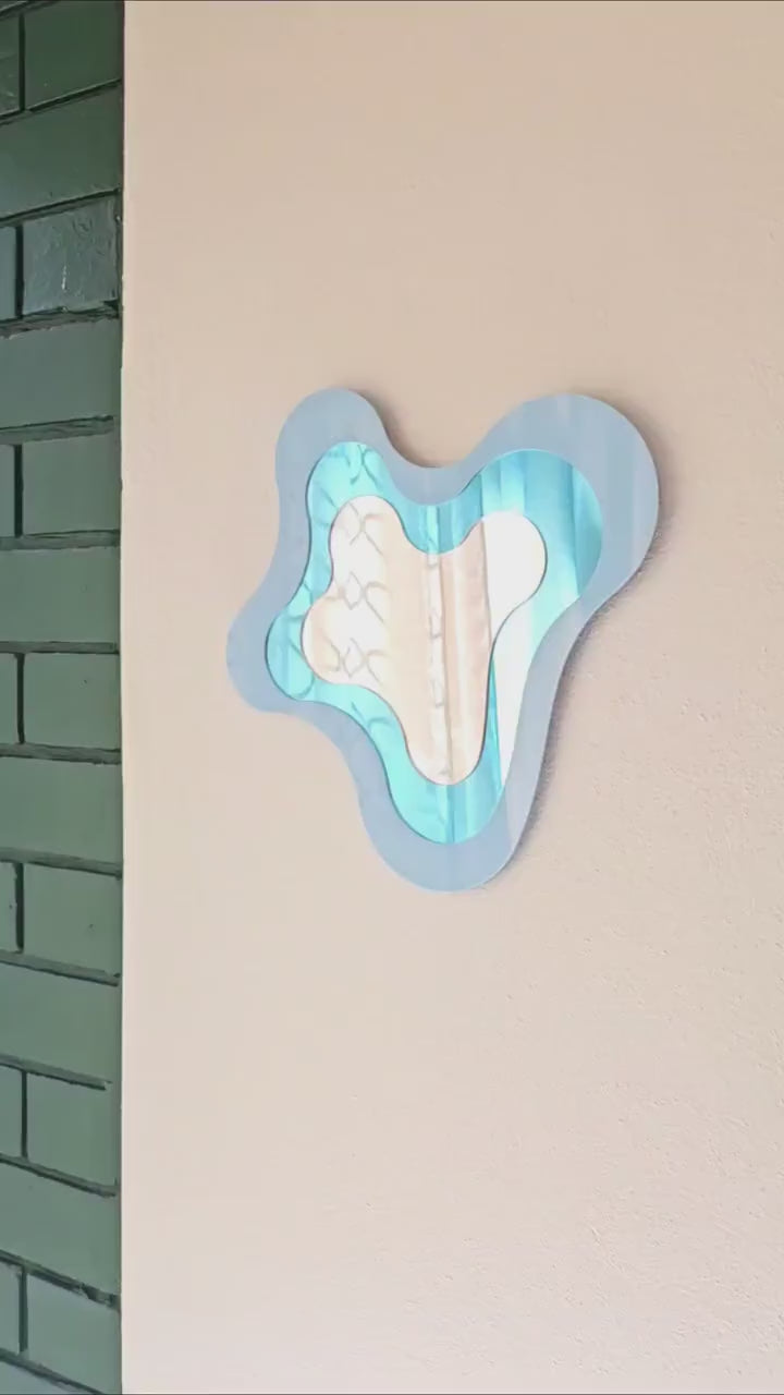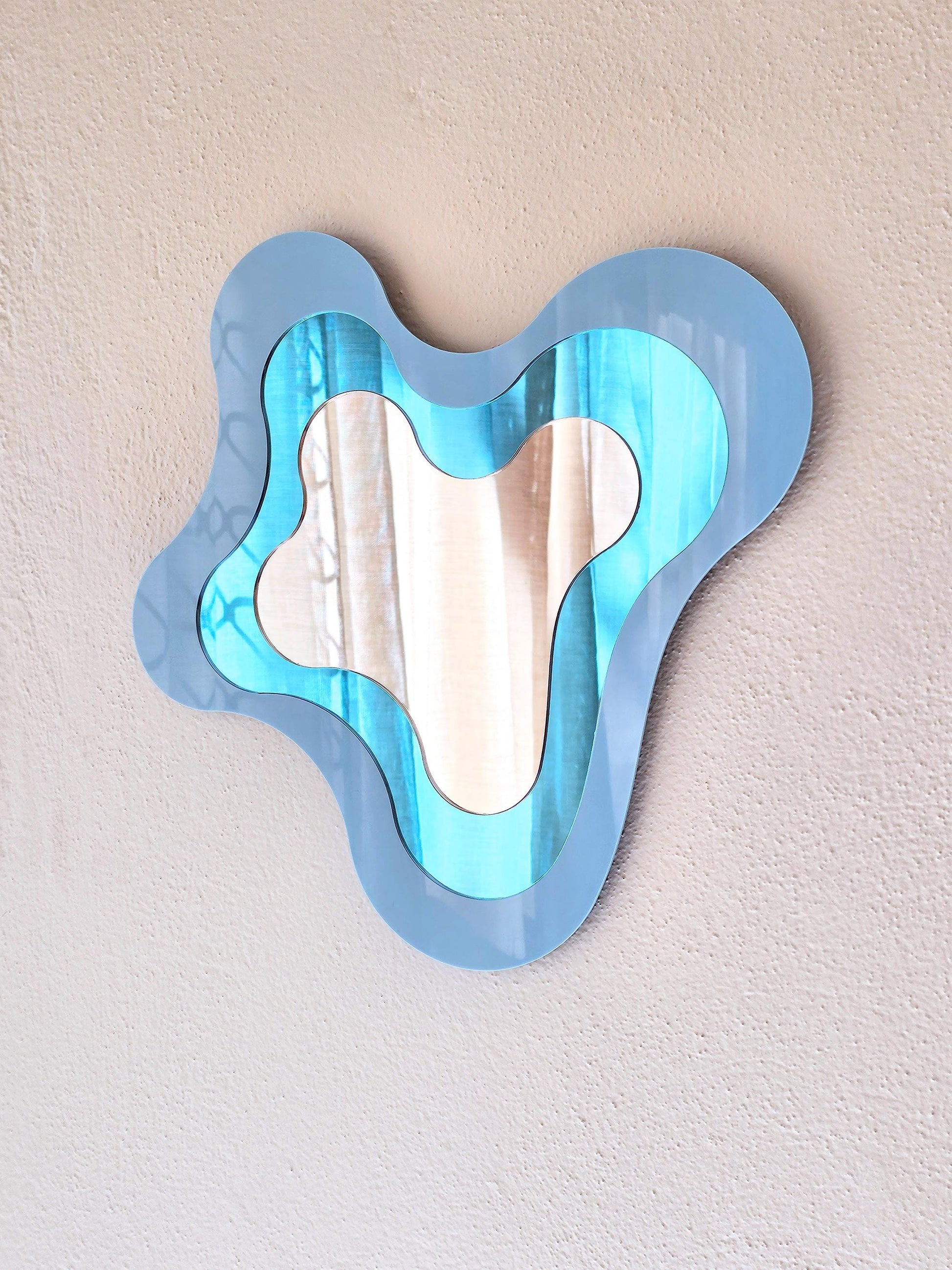 This pastel blue mirror brings a calming, artistic touch to any room with its asymmetric, organic shape and soft, dreamy hue.